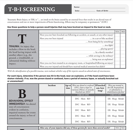 Here is a concise, easy-to-use TBI screening tool to help you determine if your patient has had a TBI. Screening results will indicate how likely it is that a past history of TBI is affecting your patient's behavior today.