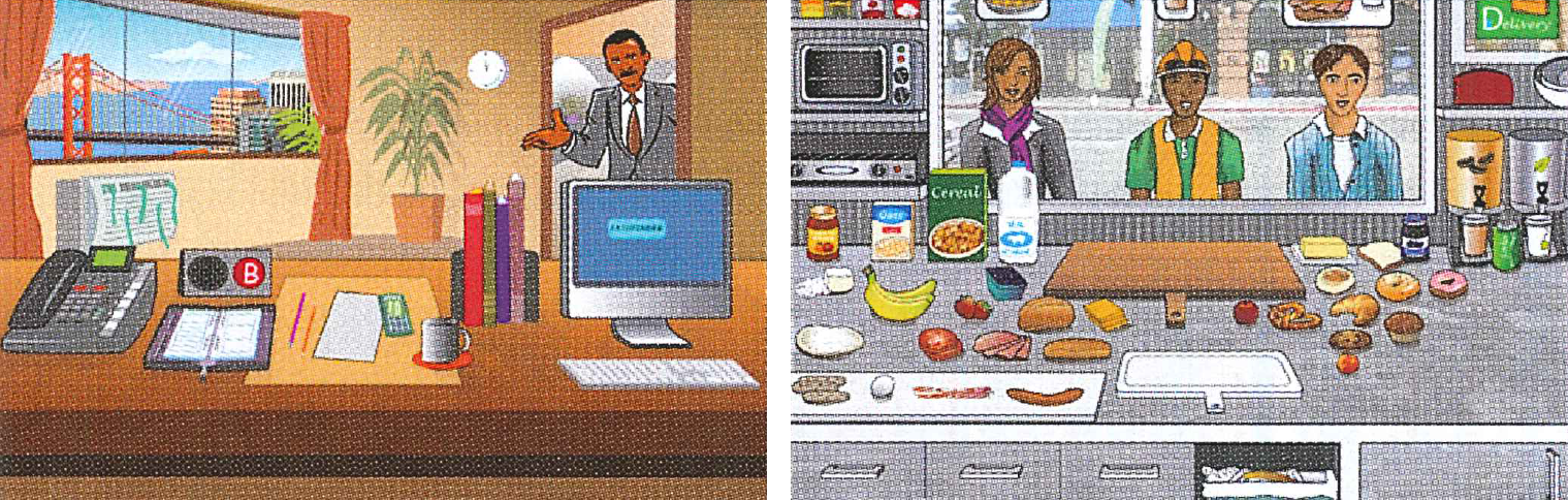 Example scenarios from a progression of cognitive contexts with integrated, parameterized challenges to goal-directed functioning: (a) managing multiple tasks in an executive suite of a corporation, and (b) serving multiple customers as a food truck entrepreneur. Gameplay progresses to managing multiple aspects of the growing company.