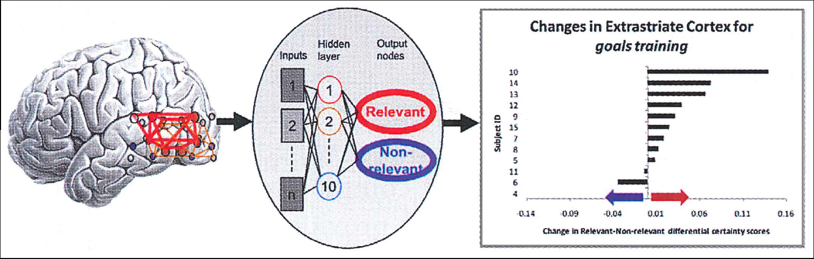 Figure 2: Multi-voxel patterns from functional imaging of posterior brain networks (left) were decoded by a neural network pattern classifier to index processing of goal-relevant (represented by red) vs. non-relevant (blue) visual information (center), with the finding that training resulted in an increased balance of processing of goal-relevant information (right).