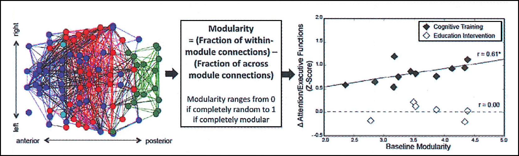 Figure 3: Functional brain networks from each individual prior to training (example, left) were entered into calculations of modularity (center), and this index was found to be predictive of changes in attention/executive functioning following training (right).