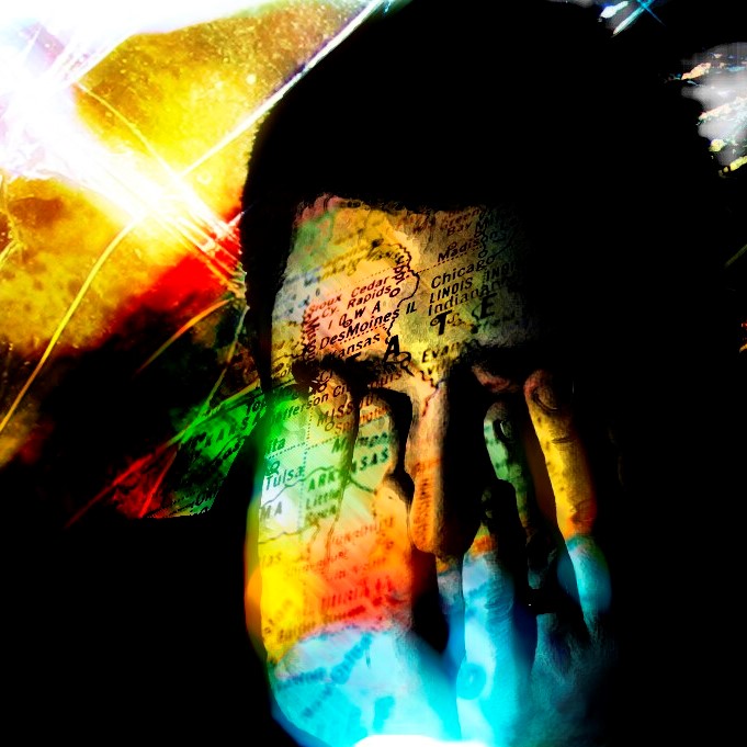 Swoops of bright colors blending to show two heads in profile.